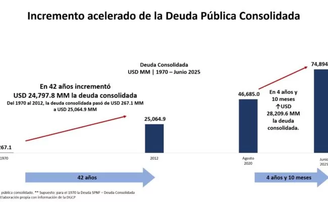 La deuda pública consolidada se ha incrementado de manera acelerada en los últimos 4 años y 10 meses (US$28,209.6 millones), cifra muy superior a la deuda acumulada (U$ 24,797.8 millones) por el país en un periodo de más de 4 décadas (42 años desde 1970 al 2012)