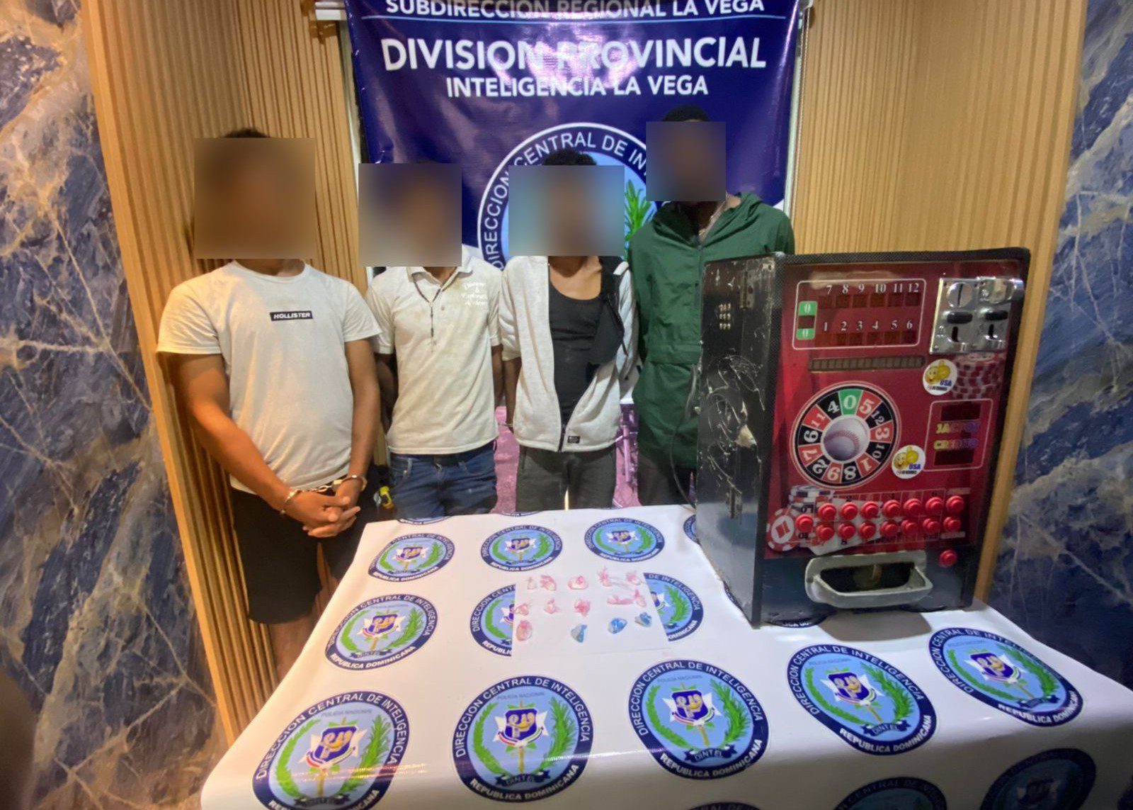 La Vega.- La Policía Nacional informó este miércoles que detuvo a cuatro hombres y que ocupó diversas sustancias controladas, una máquina tragamonedas y dos motocicletas sin documentos, durante tres operativos simultáneos realizados en los sectores Las Canas y Barrio Puerto Rico, de La Vega.