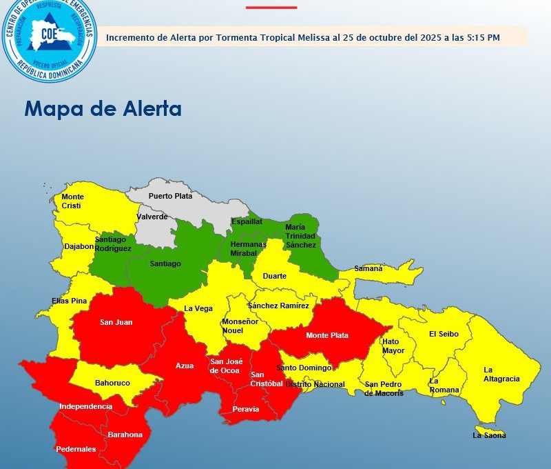 En alerta roja se mantienen las provincias Barahona, San Cristóbal, Independencia, San José de Ocoa, Monte Plata, San Juan, Azua, Peravia y Pedernales. Mientras que en verde están María Trinidad Sánchez, Santiago, Santiago Rodríguez, Hermanas Mirabal y Espaillat.