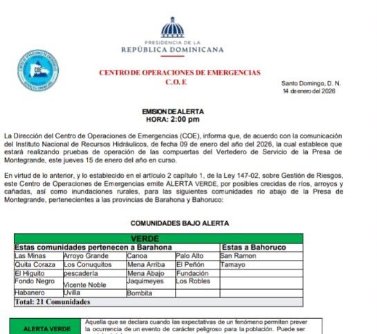 Ante esta situación, y en cumplimiento de lo establecido en el artículo 2, capítulo 1 de la Ley 147-02 sobre Gestión de Riesgos, el COE decidió emitir alerta verde por la posibilidad de crecidas de ríos y arroyos, desbordamiento de cañadas e inundaciones rurales en comunidades ubicadas aguas abajo de la referida presa.