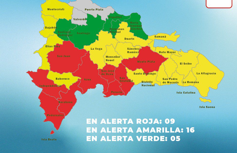 Mientras que en alerta amarilla están La Vega, Samaná, Hato Mayor, El Seibo, La Romana, Elías Piña, Duarte, Bahoruco, Monseñor Nouel, Sánchez Ramírez, Monte Cristi, Santo Domingo, San Pedro de Macorís, Distrito Nacional, Dajabón, y La Altagracia.
