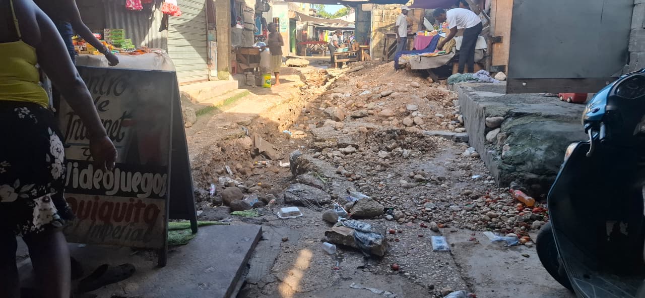 Según explicaron, el gran agujero fue dejado por brigadas de la Alcaldía Municipal de Barahona, que realizan trabajos en el área, lo que ha dificultado el acceso de clientes y vehículos, afectando considerablemente las ventas.