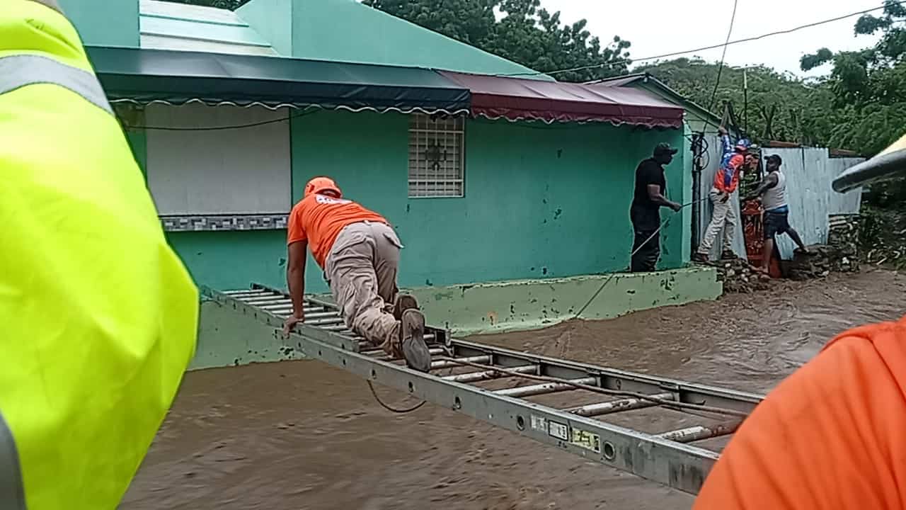 Baní.-Los miembros de la Defensa Civil rescataron este viernes a varias familias en el sector 30 de Mayo, en Baní, cuyas viviendas fueron inundadas por las lluvias provocadas por la tormenta Melissa en la provincia Peravia.