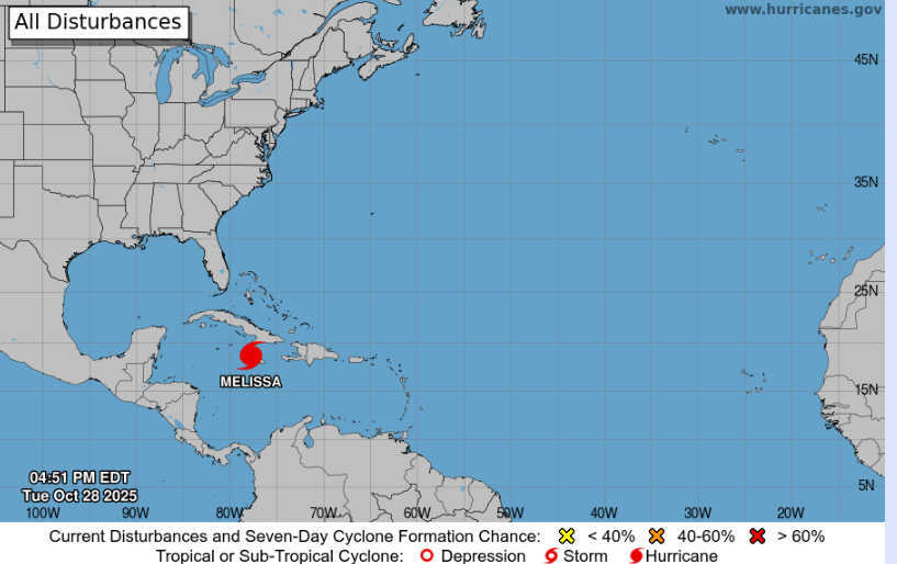 Melissa se encuentra actualmente 15 kilómetros al sur de la Bahía de Montego en Jamaica y se desplaza a unos 13 kilómetros por hora en dirección nornoreste.