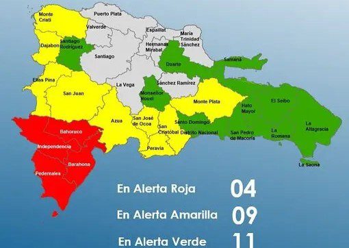 En alerta verde: Monseñor Nouel, Samaná, San Pedro de Macorís, Santo Domingo, Duarte, La Romana, Hato Mayor, La Altagracia, El Seibo, Santiago Rodríguez y el Distrito Nacional.