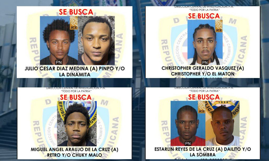 Los prófugos fueron identificados como Estarlin Reyes de la Cruz (a) “Dailito” y/o “La Sombra”, Miguel Ángel Araujo de la Cruz (a) “Retro” y/o “Chuky Malo”, Christopher Geraldo Vásquez (a) “Christopher” y/o “El Matón”, y Julio César Díaz Medina (a) “Pinpo” y/o “La Dinamita”, todos con antecedentes de violencia y conducta delictiva.