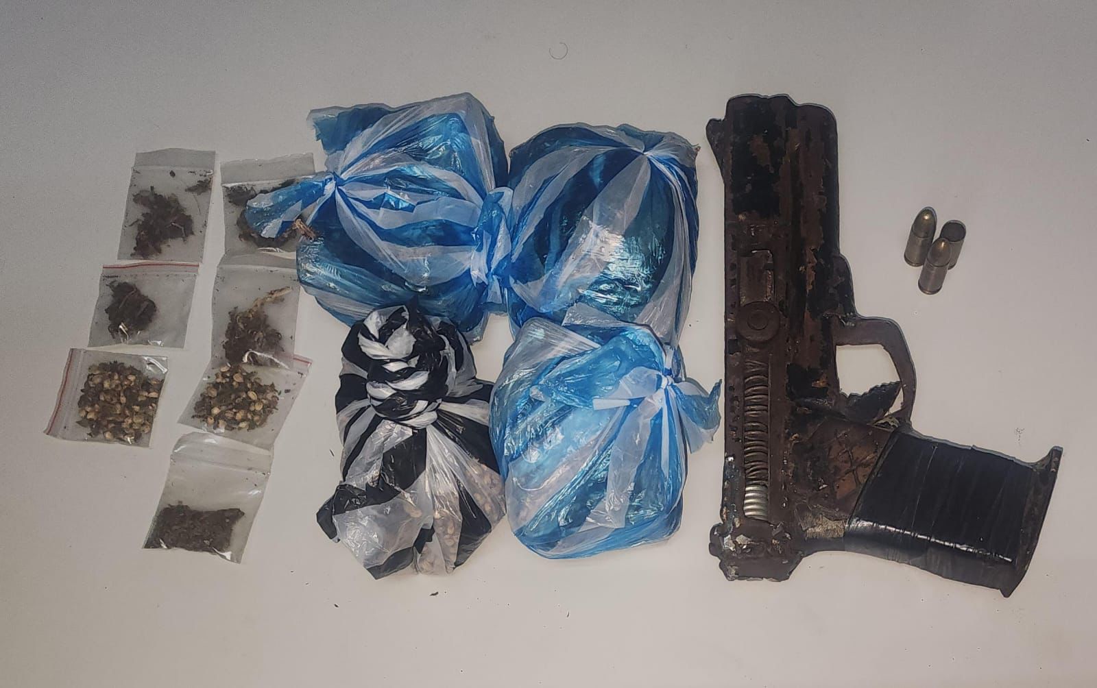 Durante la intervención se le ocupó el arma utilizada, con dos cápsulas calibre 9mm, y una funda negra conteniendo cuatro porciones de un vegetal presumiblemente Marihuana y siete porciones pequeñas del mismo tipo, con un peso aproximado de 342.8 gramos.