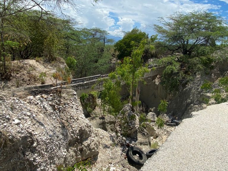 Bahoruco.- El socavón en el tramo carretero entre Villa Jaragua y Las Clavellinas (Cañada Honda) continúa sin resolver.